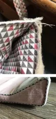Het midden van het zijstuk en het middenstuk markeer ik met een speld. Dan leg ik beide delen met de goede kanten en de spelden op elkaar. Ik speld het middenstuk rondom het zijstuk en naai met het ritsvoetje dicht langs het pipingband. Ik controleer aan de goede kant of ik dicht genoeg langs het band hebt gestikt. Waar nodig markeer ik met een speld en stik het iets dichter langs het band nogmaals door. De binnenkant werk ik af met de lockmachine.
