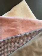 Uit het wafelkatoen knip ik 2 stukken (voor de zij- en onderkant) van 25x69cm, uit de katoenen fleece 2 stukken (voor de banen naast het middenstuk) van 13x69 cm) en uit wafelsterrenstof 1 maal 21x69 cm voor het middenstuk. Het zijpatroondeel knip ik 2 maal uit de wafelsterren stof.