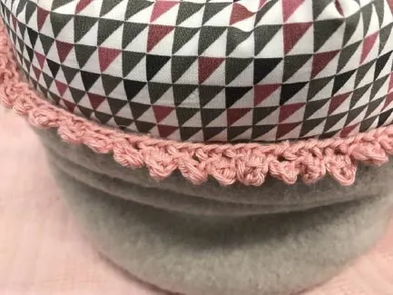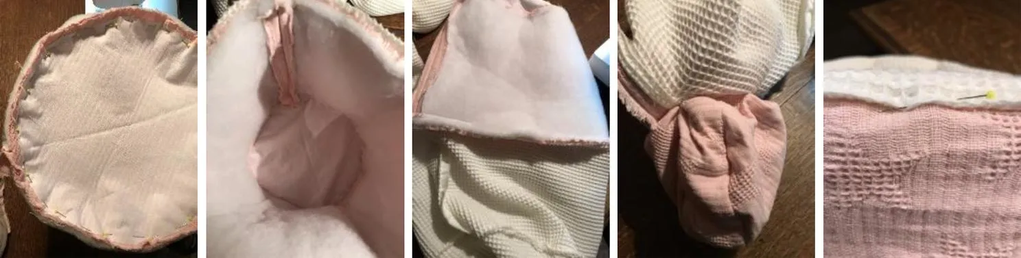 Door de spelden van de cirkel en bovenkant op elkaar vast te zetten en aan elkaar stikken ontstaat er een mandje. Dit doe ik met beide stoffen. De ronde naden knip ik af op 0,5 cm. Nu leg beide mandjes met de goede kanten op elkaar en stik de bovenrand, op 10 cm na, dicht. Door de opening van 10 cm keer ik de stofjes weer met de goede kant naar buiten en leg ze in elkaar. De opening van 10 cm naai ik met de hand dicht. Op 5 cm vanaf de bovenrand maak ik nog een stiklijn, hierna vouw ik de rand om.