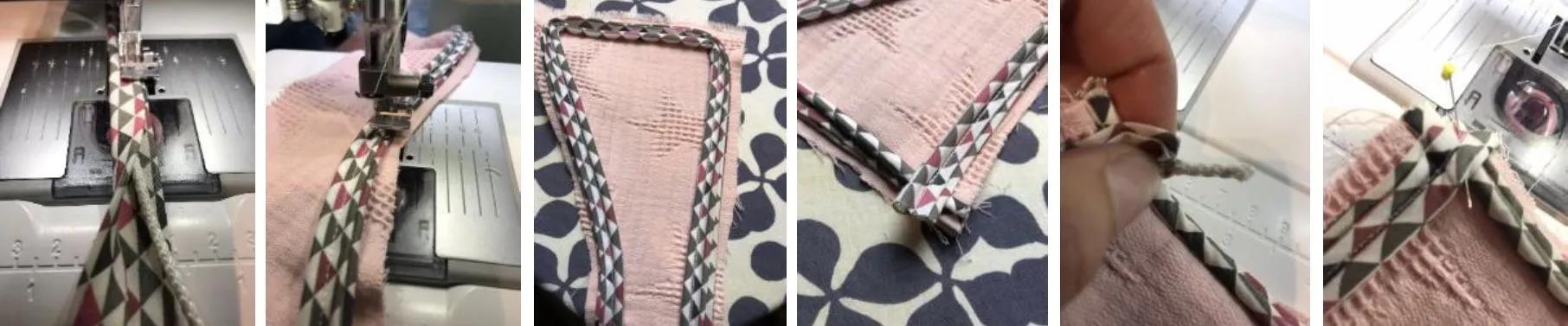 Ik leg een stuk koord van 4 mm in het midden van het biaisband. Door dicht langs het koord te stikken, met een ritsvoetje, ontstaat er pipingband.