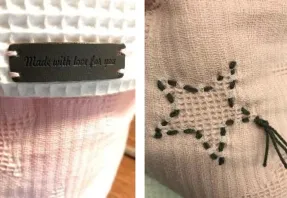 Met de hand naai ik er nog een leuk merkje op. Rondom een aantal sterren maak ik met een rijgnaald en een dubbele draad (Catona) een grove rijgsteek. Door de draad aan het begin en eind wat langer te laten kan ik ze samen dichtknopen. Ik knip de draden op 1,5cm af en laat dit zo hangen.