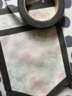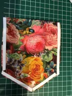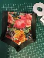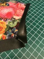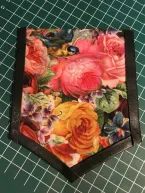 Voor ik begin verstevig ik het zakje aan de achterzijde rondom met naadband (ook op de vouwkant van het beleg) zodat de rek eruit is. Ik strijk het beleg met de goede kant naar binnen. Aan de goede kant en aan de achterkant van het borstzakje plak ik wondertape. Het biaisband plak ik aan de goede kant rond het zakje met ruimte bij de hoekjes. Nu plak ik het rondom aan de achterzijde vast en knip bij de hoekjes het teveel aan ruimte weg. Aan de voorzijde kan ik nu de zijkant van het bandje netjes over de onderzijde plakken. Pas als het band netjes geplakt zit stik ik het op de aangegeven plaats op het voorpand.
