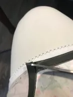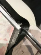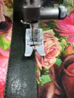 Het boven voorpand en onderpand en de schoudernaden stik ik met de stretchsteek aan elkaar en strijk ze open. Met wondertape plak ik het leren biaisband over de naden en met een teflon voetje op de naaimachine stik ik het vast. Door het teflonvoetje gaat dit heel gemakkelijk. Houd er rekening mee dat het voorpand door het lerenbandje minder rekt. Kun je de rek niet missen dan kan je met tricot biaisband werken.