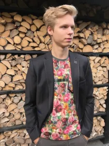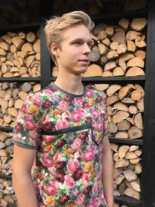 Een vrolijk heren T-shirt, model Isaac uit de La Maison Victor mannenspecial. Stenzo 18/19 12227 Bloemen tricot in combinatie met een leren biaisbandje om het iets stoerder te maken.