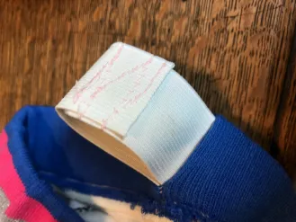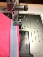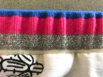Elastiek op taille lengte rijg ik door de boord en stik het daarna goed op elkaar vast. Aan de onderkant strijk ik eerst de zoom in de rok en daarna stik deze op de goede kant met een sierstiksel.
