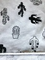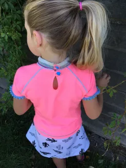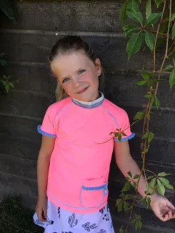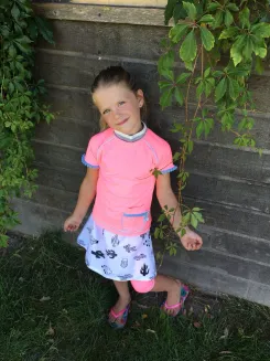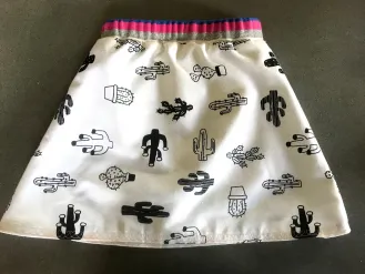 Om er een leuke vakantie outfit van te maken maakte ik shirtje nr 16 uit Knippie nr 3 2018. De legging tekende ik na van een goed passende legging van Isa. In plaats van 2 stoffen zoals in de Knippie gebruikte ik maar een stofje. Langs de hals heb ik hetzelfde boord gebruikt als aan het rokje, maar nu enkel, dus niet dubbel gevouwen. Voor nog meer contrast heb ik rekbaar paspelband en bolletjes band gebruikt. Van de stof van het rokje maakte ik een “”cactus merkje”. Door dit soort details maak je een outfit helemaal af.