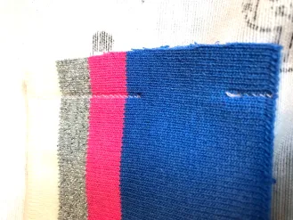 Met de goede kanten op elkaar stik ik de zijnaden en strijk ze open. Voor de tailleband gebruik ik een leuke contrasterende boordstof. Ik meet de boordstof af op de lengte van de taille van het rokje. Met de goede kanten op elkaar stik ik de zijnaad van het boord maar hou 3cm open. Met de verkeerde kanten op elkaar dubbelgevouwen stik ik het boord op de goede kant aan de taille van het rokje.