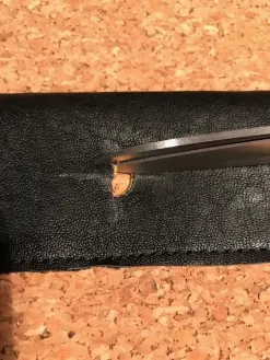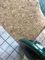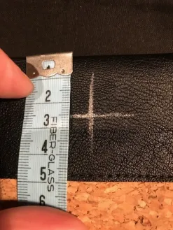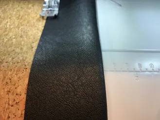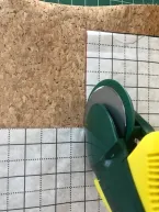 Voor ik het patroon ga uitsnijden verstevig ik zowel het kurk als het kunstleer met plakkatoen, hierdoor wordt het kurk steviger en krijgt het een zwarte binnenkant. Bij het kunstleer gaat ook de rek eruit. Zowel het kurk als het kunstleer snij ik met een snijmes, op die manier kan ik precies langs het patroon snijden. Het volledige patroon snij ik uit in kurk. Het middenstuk snij ik uit kunstleer. Voor de bovenkant snij ik nog 2 rechte stroken kunstleer van 7x45 cm en 2 vierkantjes van 6x6 cm.