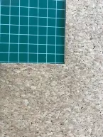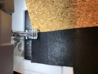 Om de tas iets steviger te maken gebruik ik extra sterk garen van Gutermann. Op de spoel gebruik ik gewoon garen met een microtex naald. Als eerste naai ik het onderstuk van kunstleer op het middenstuk van het kurken tasdeel. Dan stik ik de strook kunstleer aan de binnenkant op 1,5 cm vanaf de bovenkant vast (goede kant leer op verkeerde kant kurk). Nu sla ik de strook naar buiten om en stik hem op de goede kant door. Ik knip een stuk keperband van 56 cm lang en stik dit dubbel. De vierkantjes stik ik in het midden 2,5 cm onder de strook leer rondom vast. Hierbij stik ik bij een vierkantje de reep keperband ertussenuit. In het midden van het kurk stik ik het kunstleren middenstuk vast, zo wordt de onderkant van de tas extra stevig.