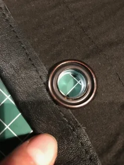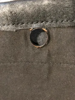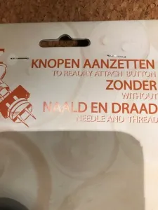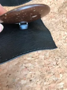 De grote knoop bevestig ik zonder naald en draad, in het midden van het kunstleren vierkantje zonder keperband. Op de achterkant van de verpakking staat precies hoe dit werkt. Het is heel eenvoudig en erg sterk, daarom kies ik voor deze manier.