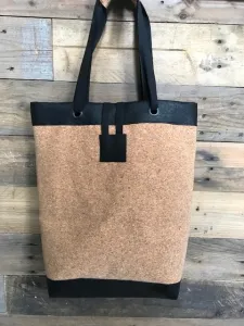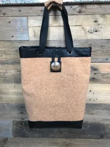 Boodschappentassen heb je nooit teveel. Vandaar een tas met een eenvoudig patroon dat ik zelf heb getekend. Gemaakt met kurk, kunstleer, keperband, plakkatoen, metalen ogen en een grote knoop als sluiting.