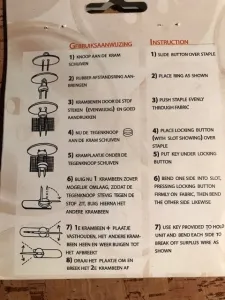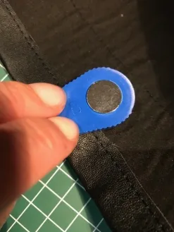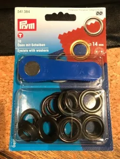 Om de ringen goed te plaatsen teken ik met kleermakerskrijt een kruis op het middelpunt. Hier geef ik met de schaar (kruislings) knipjes in en daarna knip ik er een rondje van 1cm uit. Ik plaats de ring die aan de buitenkant komt in de opening, leg hem op het metalen rondje en leg de andere helft van de ring erop. Nu plaats ik het metalen gedeelte van het blauwe hulpstukje precies in de ring en sla er voorzichtig (met een hamer) meerdere keren op totdat de ring goed vast zit.