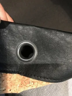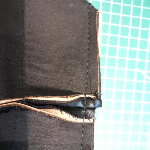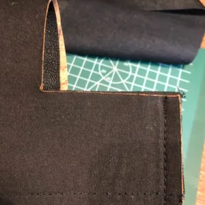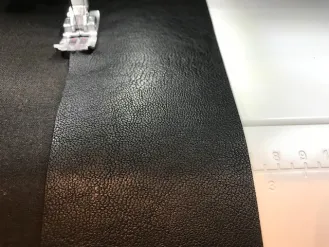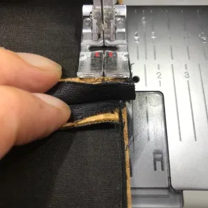 Nu sluit ik eerst de zijnaden van de tas, door ze met de goede kanten op elkaar te stikken. Hierbij is het belangrijk om het kunstleer zowel boven als onder zo goed mogelijk te laten doorlopen. De zij-onderkanten leg ik met de goede kanten op elkaar (met het zijstiksel in het midden) en stik het met het zijstiksel opengevouwen goed vast. Ik keer de tas met de goede kant naar buiten, duw de onderkant goed en de tas is klaar!
