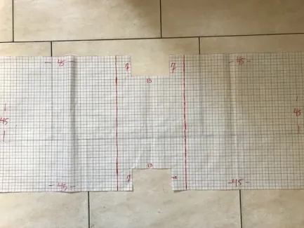 Op patroontekenpapier met ruitjes teken ik het patroon. Ik wil een boodschappentas die ruim maar tegelijkertijd niet te groot is, zodat je hem ook gewoon over je schouder kunt dragen. Met de gekozen afmetingen lukt dat perfect. Op de foto van het patroon heb ik de maten in centimeters aangegeven. Het middenstuk is een extra patroondeel.