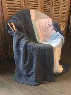 Als alle hoeken klaar zijn stik ik het biaisband vast op de gebreide stof. Hierbij stik ik nogmaals over het eerste stiksel heen, zodat ik ook een dubbele stikrand aan de achterkant heb. Voor wat speelse accenten stik ik nog een rand biaisband rondom een vierkant. Ook zet ik een paar knopen door en door op de deken en maak ik met katoenen garen een paar kruissteken.