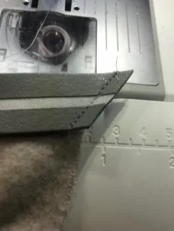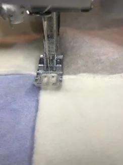 Om een leuk effect te krijgen stik ik de blokken niet aan elkaar maar op elkaar. Ik leg ze ongeveer 5mm over elkaar heen en stik ze in het midden, dus 2 á 3mm vanaf de zichtbare snijkant. Het is wel belangrijk om te kijken welke kant van de stof rekbaar is, zodat alle blokken dezelfde kant op liggen.