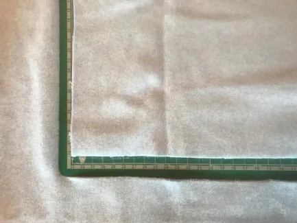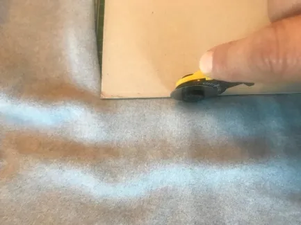 Om maatvast te kunnen snijden maak ik een vierkante mal van karton. Met een rolmes snijd ik langs de mal diverse vierkanten uit katoenen fleece. In mijn deken zitten 16 vierkanten van 33x33 cm in verschillende kleuren.
