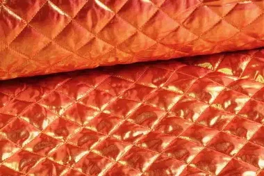 Gewatteerde, doorgestikte in de kleur oranje. De stof heeft een mooie glans. Deze doorgestikte, gestepte kwaliteit is licht van gewicht en gevuld met wattine. De stof leent zich goed om te decoreren maar kan zeker ook ingezet worden het maken van kleding zoals bijvoorbeeld een bodywarmer of jas.