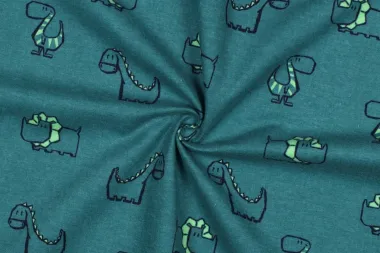 Flanel stof met dinosaurussen in de kleur petrol. Deze stof heeft een breedte van 140 cm en een gewicht van 165 g/m2.