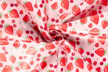 Tafelzeil in de kleur lichtroze, bedrukt met rode aardbeien, kersen en frambozen. Deze stof heeft een breedte van 140 cm en een gewicht van 260 g/m2.