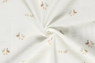 Hydrofiel stof geverfd en geprint met eenden in de kleur gebroken wit. Deze stof heeft een breedte van 130 cm en een gewicht van 130 g/m2.