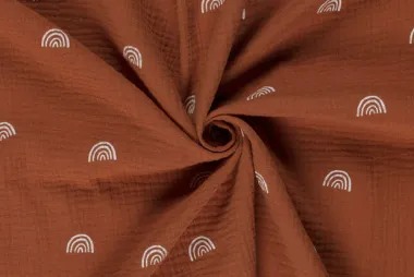 Hydrofiel stof geverfd en geprint met regenboog in de kleur terra. Deze stof heeft een breedte van 130 cm en een gewicht van 130 g/m2.