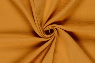Hydrofiel stof double gauze in de kleur okergeel. Deze stof heeft een breedte van 130 cm en een gewicht van 130 g/m2.