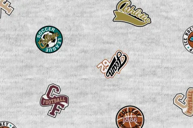 Joggingstof met football labels (er op gedrukt) in de kleur grijs gemêleerd. Deze stof heeft een breedte van 155 cm en een gewicht van 280 g/m2.