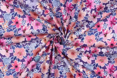 Poplin katoen stof in de kleur paars, met digitale bloemen in multi kleuren. Deze stof heeft een breedte van 145 cm en een gewicht van 110 g/m2.