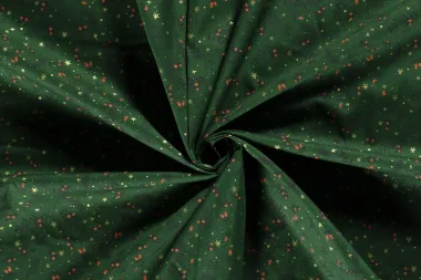 Katoen poplin stof in de kleur groen, bedrukt met kersttakken en goudkleurige folie 'sterretjes'. Deze stof heeft een breedte van 145 cm en een gewicht van 110 g/m2.