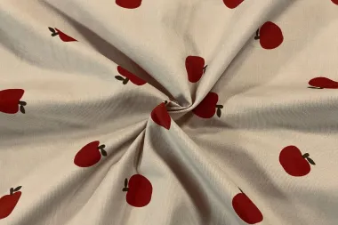 Baby corduroy 21w stof met appels in de kleur beige. Deze stof heeft een breedte van 140 cm en een gewicht van 145 g/m2.