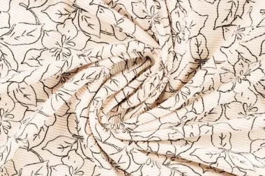 Rekbare washed corduroy stof met bloemen in de kleuren gebroken wit en zwart. Deze stof heeft een breedte van 145 cm en een gewicht van 340 g/m2.
