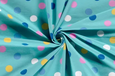 French Terry jersey in de kleur aquablauw, bedrukt met stippen in multi kleuren. Deze stof heeft een breedte van 150 cm en een gewicht van 250 g/m2. De stippen hebben een doorsnede van ca. 3 cm.