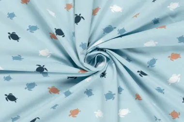 Katoenen tricot bedrukt met met schildpadden in de kleur lichtblauw. Deze stof heeft een breedte van 150 cm en een gewicht van 200 g/m2.