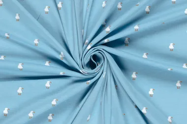 Katoenen tricot bedrukt met met zeemeeuwen in de kleur babyblauw. Deze stof heeft een breedte van 150 cm en een gewicht van 200 g/m2.