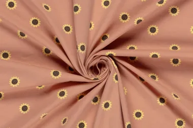 Katoenen tricot bedrukt met zonnebloemen in de kleur perzik. Deze stof heeft een breedte van 140 cm en een gewicht van 200 g/m2.